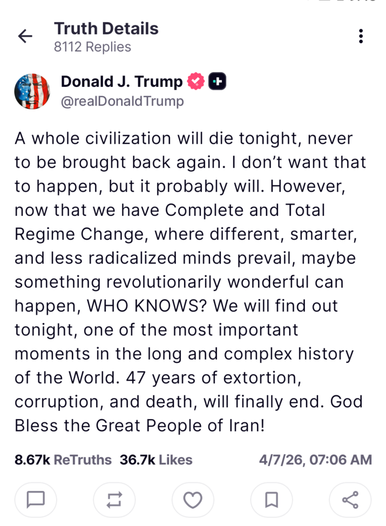 The president posted a strong message on Truth Social. He warned that a whole civilization could vanish if no deal happens.