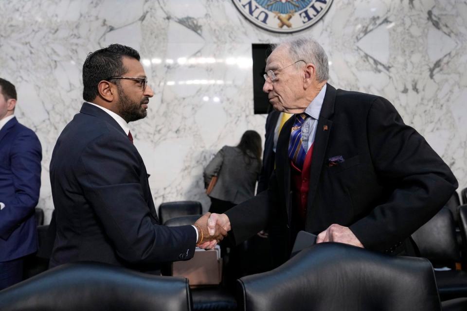 Kash Patel shakes the hand of Sen. Chuck Grassley (R-Iowa) as he departs following a confirmation hearing before the Senate Judiciary Committee at the Capitol in Washington